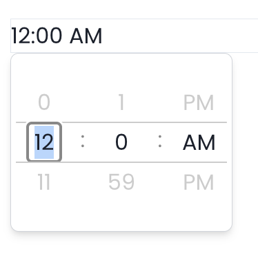 12 Hour Format When this option is disabled, the time picker uses the 12 hour clock. You select the hour, the minutes, and whether the time is AM or PM.