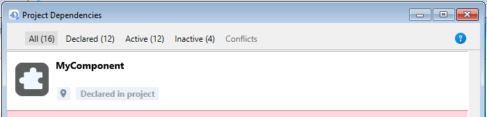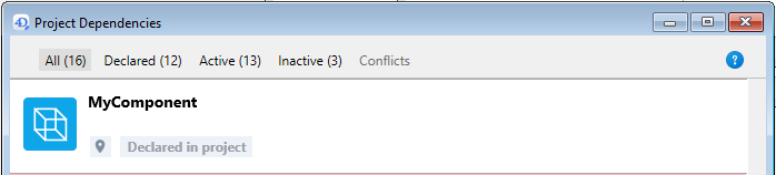 Una vez creado, el componente se añade inmediatamente al proyecto, es accesible en la ventana Dependencias del proyecto y está disponible para su edición.