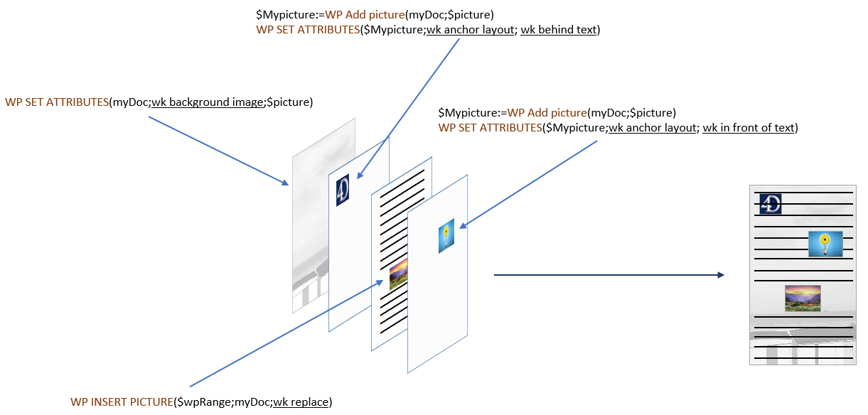 Las imágenes ancladas se agregan con una posición absoluta, delante y detrás del texto, y también se anclan a la página o partes específicas de un documento (es decir, encabezado, pie de página, secciones). Establecer una posición absoluta para una imagen se logra con los comandos WP Add picture y WP SET ATTRIBUTES.