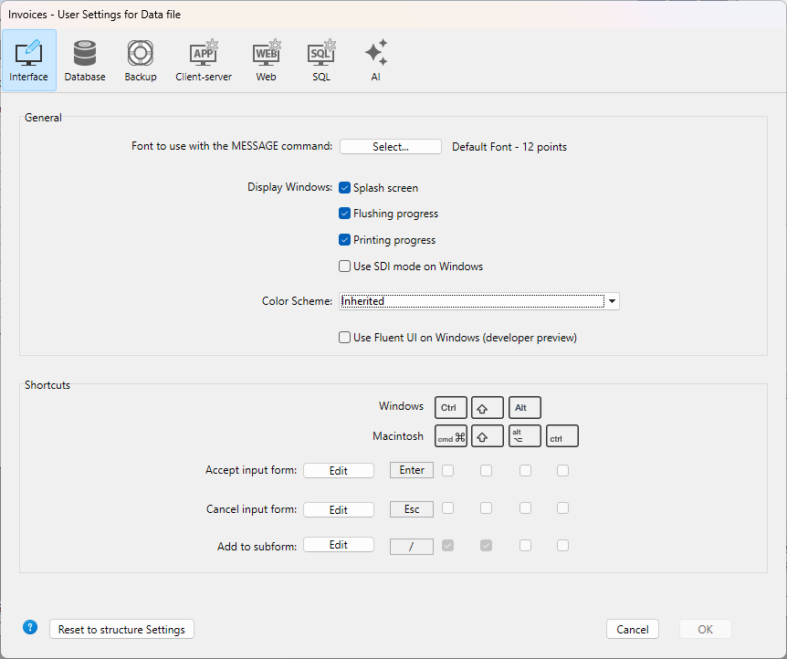 Modo propiedades usuario: una parte de los parámetros personalizados se almacena en un archivo settings.4DSettings en la carpeta Settings (para todos los archivos de datos) o en la carpeta Data (para este archivo de datos) y se utilizan en lugar de los parámetros de estructura. Este modo es adecuado para la fase de despliegue de las aplicaciones de escritorio. Este modo se activa mediante una opción situada en la página Seguridad de las Propiedades.