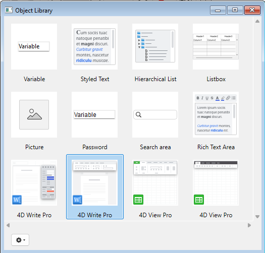 オブジェクトライブラリー内("入力エリア"テーマ内)にある4D Write Pro オブジェクトを仕様することで設定済みの4D Write Proエリアを作成することができます: