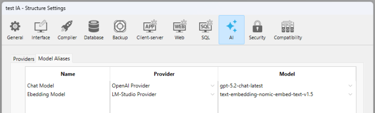 Using the Settings dialog box, the 4D developer can define a custom provider name (for example "open-ai-v1") and use this custom name in the code. They can also test it using their API key.