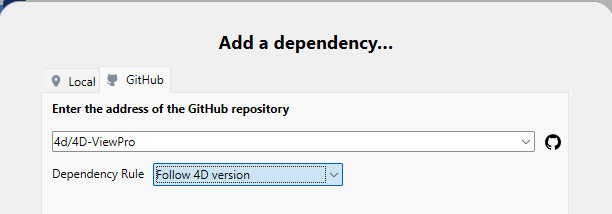 - Select 4d/4D-ViewPro in the default list of components and (recommended) Follow 4D version as Dependency rule, then click Add.
